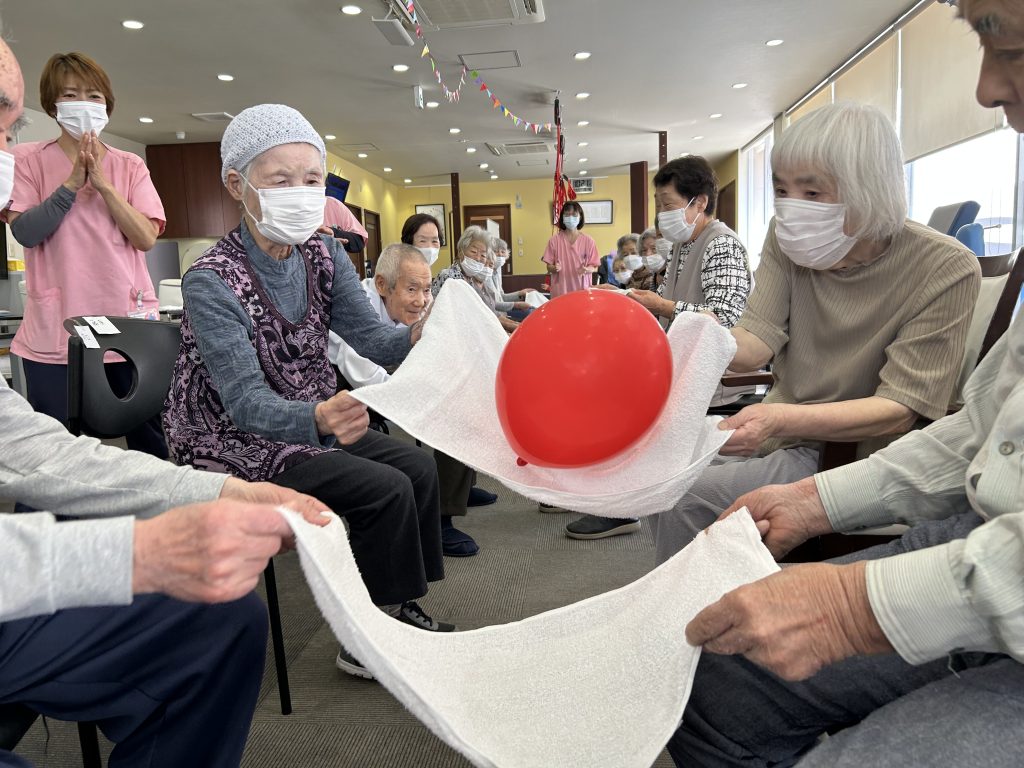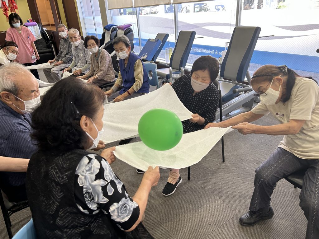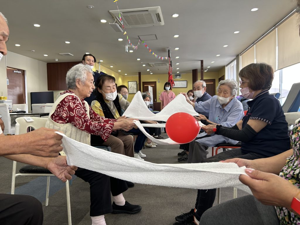 タオルで風船を隣へ送り、端から端までの往復タイムを競います!