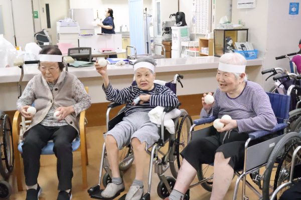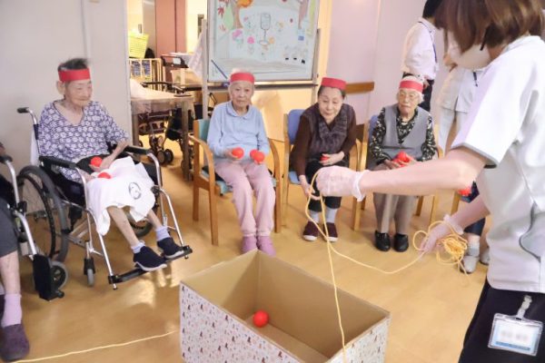 皆さん、掛け声に合わせて元気よく玉を投げ、とても上手に入れていました