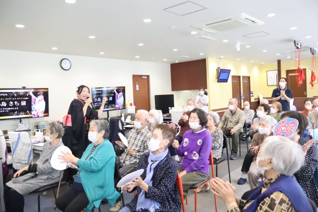 オアシス長瀬ではご利用者様に『芸術の秋』を楽しんでいただくため、10月・11月に歌手の方をお招きし、歌謡ショーを開催いたしました