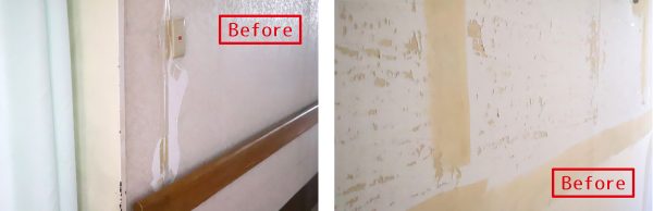長年の使用により、一部に破れや汚れが見られた壁紙を、すべて剥がして張り直しました