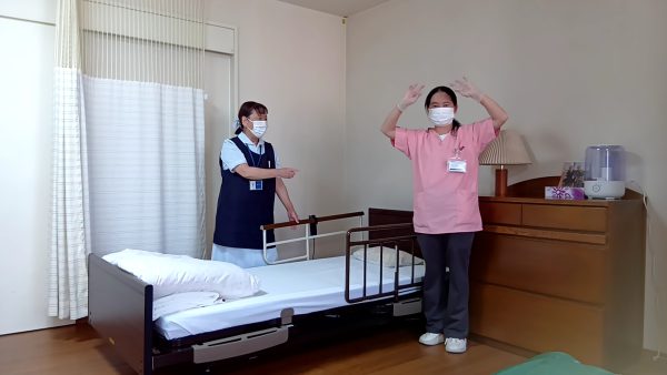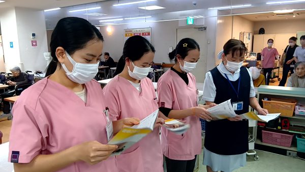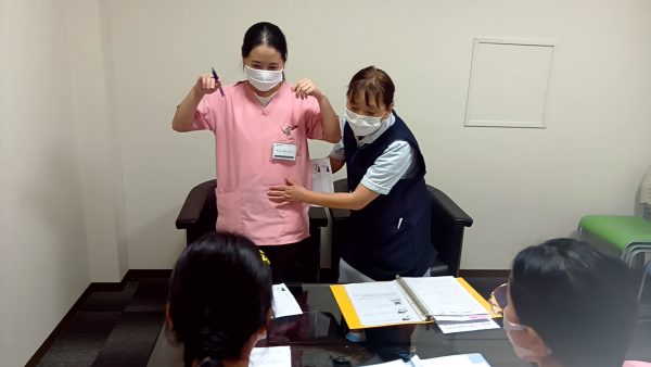 診察の後は、介護技術の中でも特に奥が深い「排泄ケア(オムツ交換)」の研修です