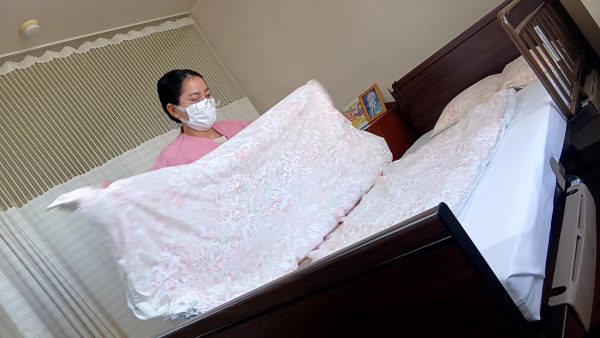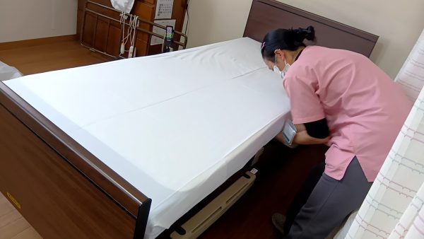 これは見た目の美しさだけでなく、シーツをずれにくくし、入所者様の背中にしわが当たらないようにするための、快適さを守る技術です