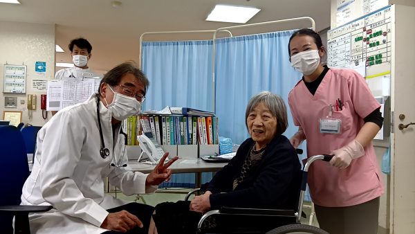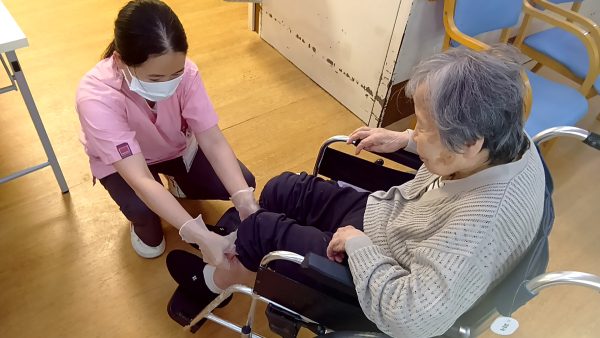 入所者様を車椅子で診察室までご案内し、診察後は靴下と靴を履いていただきます