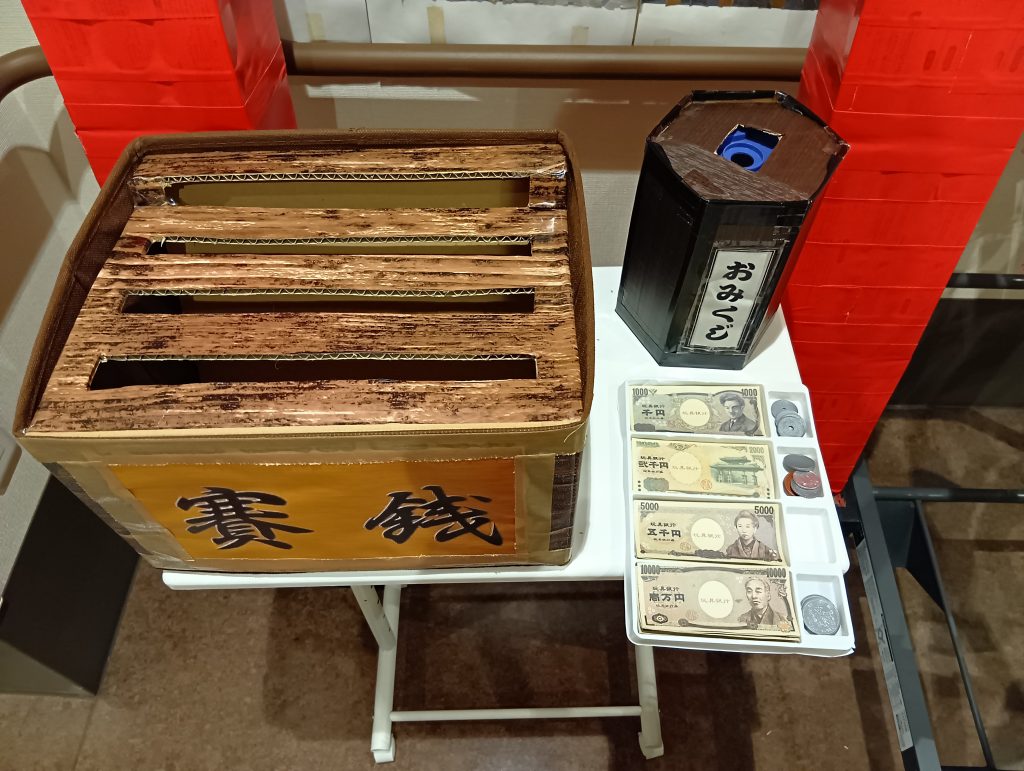 クオリティの高い賽銭箱とおみくじ お札や小銭もバッチリ準備!