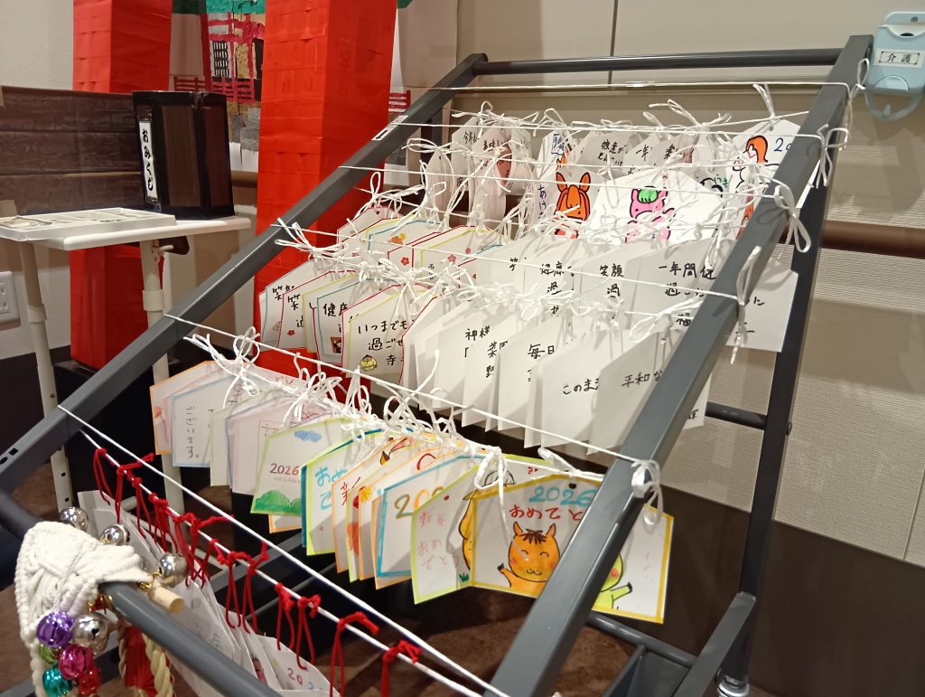 絵馬には、入所者様ご自身が書かれたり、スタッフが代筆したりしながら、今の想いを綴っていただきました