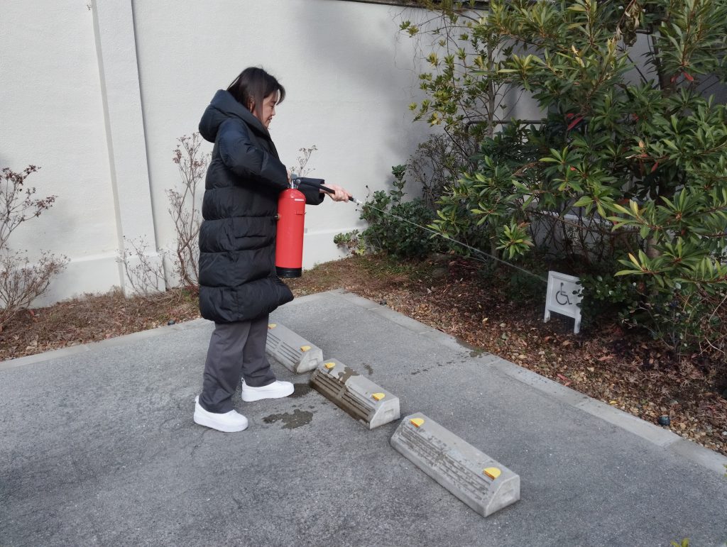 続いて、消火訓練です 消火器に見立てた水を使い、的に向かって放水しました