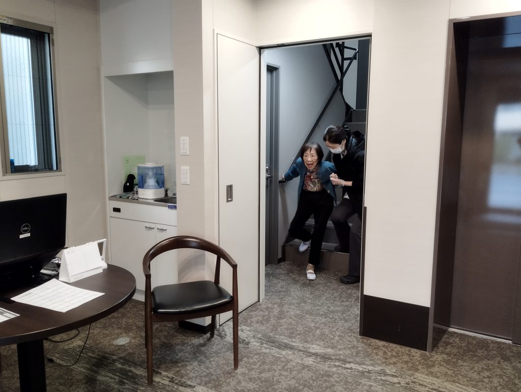 和やかな場面もありつつ、無事に全員が1階ロビーへ到着しました 皆さん、本当にお疲れ様でした