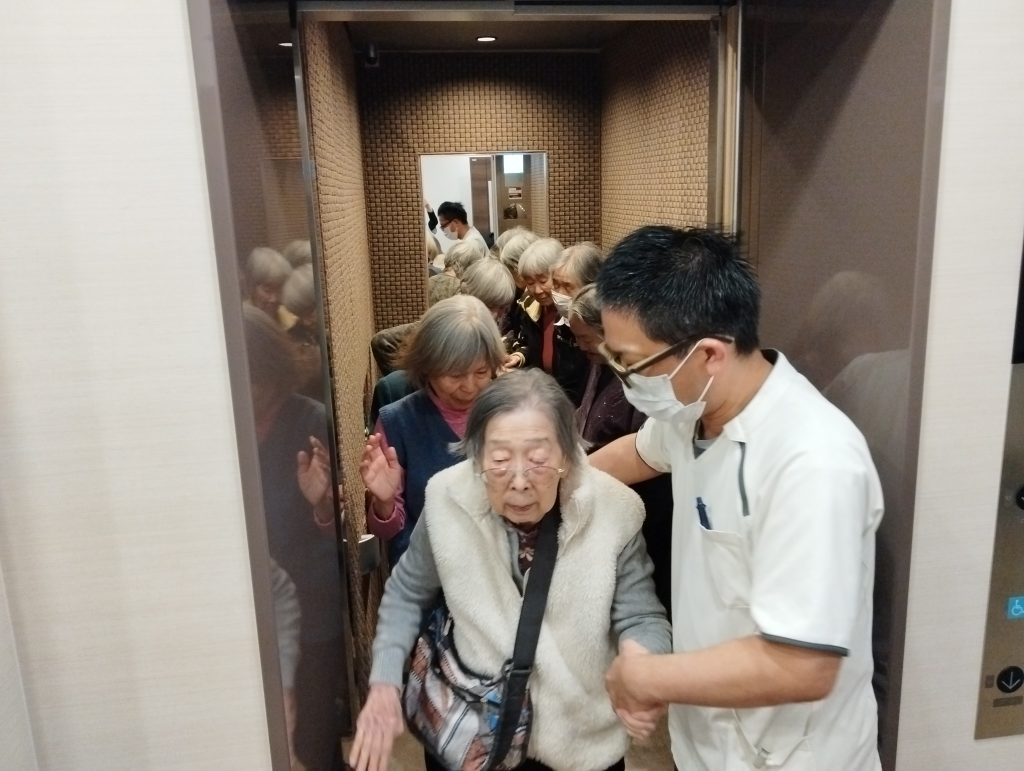 こちらはエレベーターを使用した避難の様子です 誰ですか~おしゃべりしているのは~(。-`ω-)