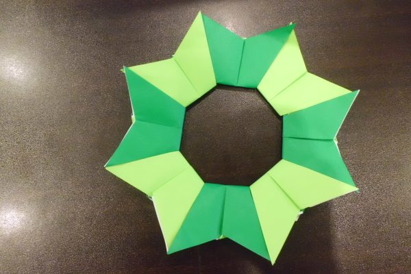 緑と黄緑の折り紙を交互に繋げていきます