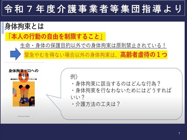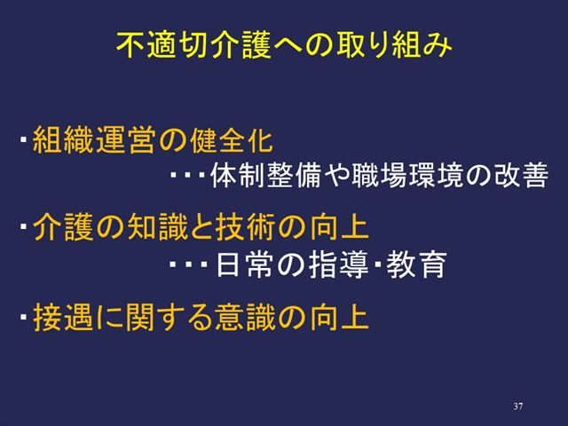 このテーマの研修は介護施設の従事者が必ず受講しなければならない「必須研修」であり、重要なテーマと位置付けられています
