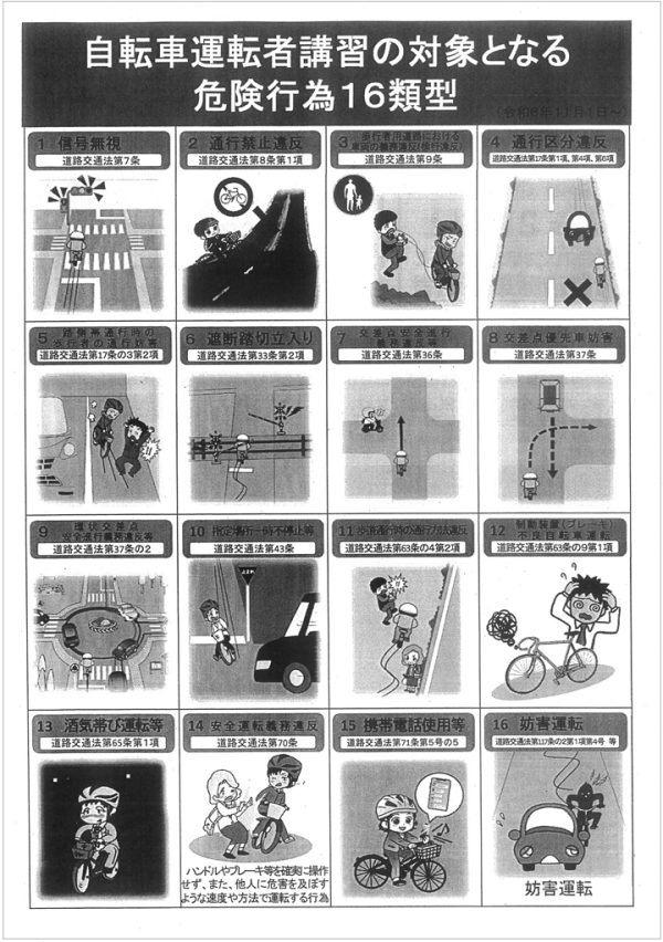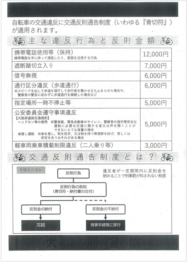 まず、自転車の交通違反に対して、交通反則通告制度(いわゆる「青切符」)が適用されることについて説明がありました
